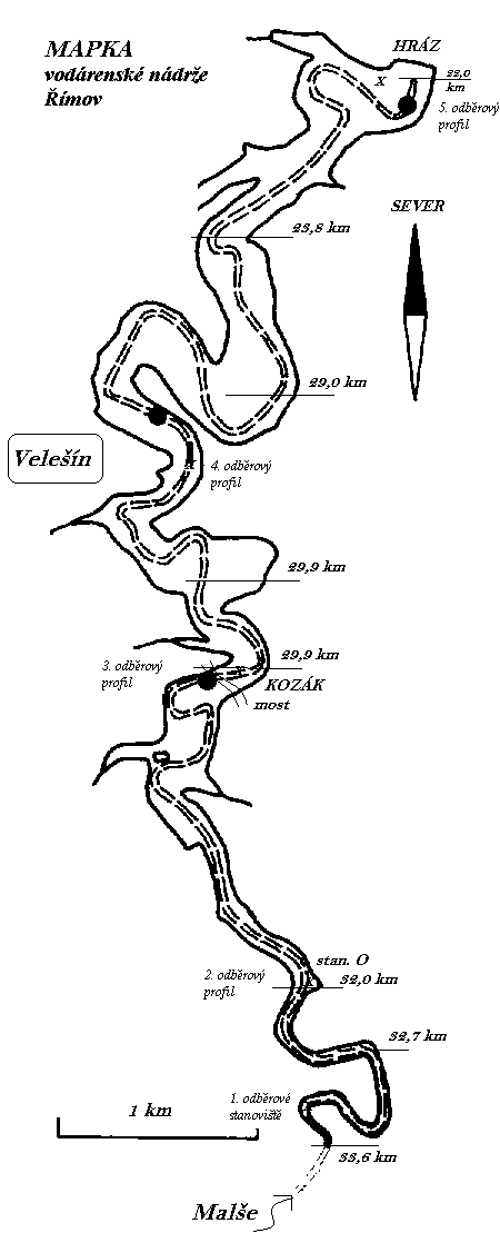 Vodárenská nádrž Římov, nacházející se mezi obcemi Besednice - Sv.Jan n.Malší - Velešín, nedaleko Českých Budějovic, byla vzorkována na pěti profilech od přítoku na říčním kilometru 33,7 řeky Malše až po hráz na ř.km 22,5-tedy podél celé cca11 km dlouhé přehrady. Vzorky vody a sedimentů byly odebírány ve spolupráci s pracovníky HBU AV ČR pomocí gravitačních sond.